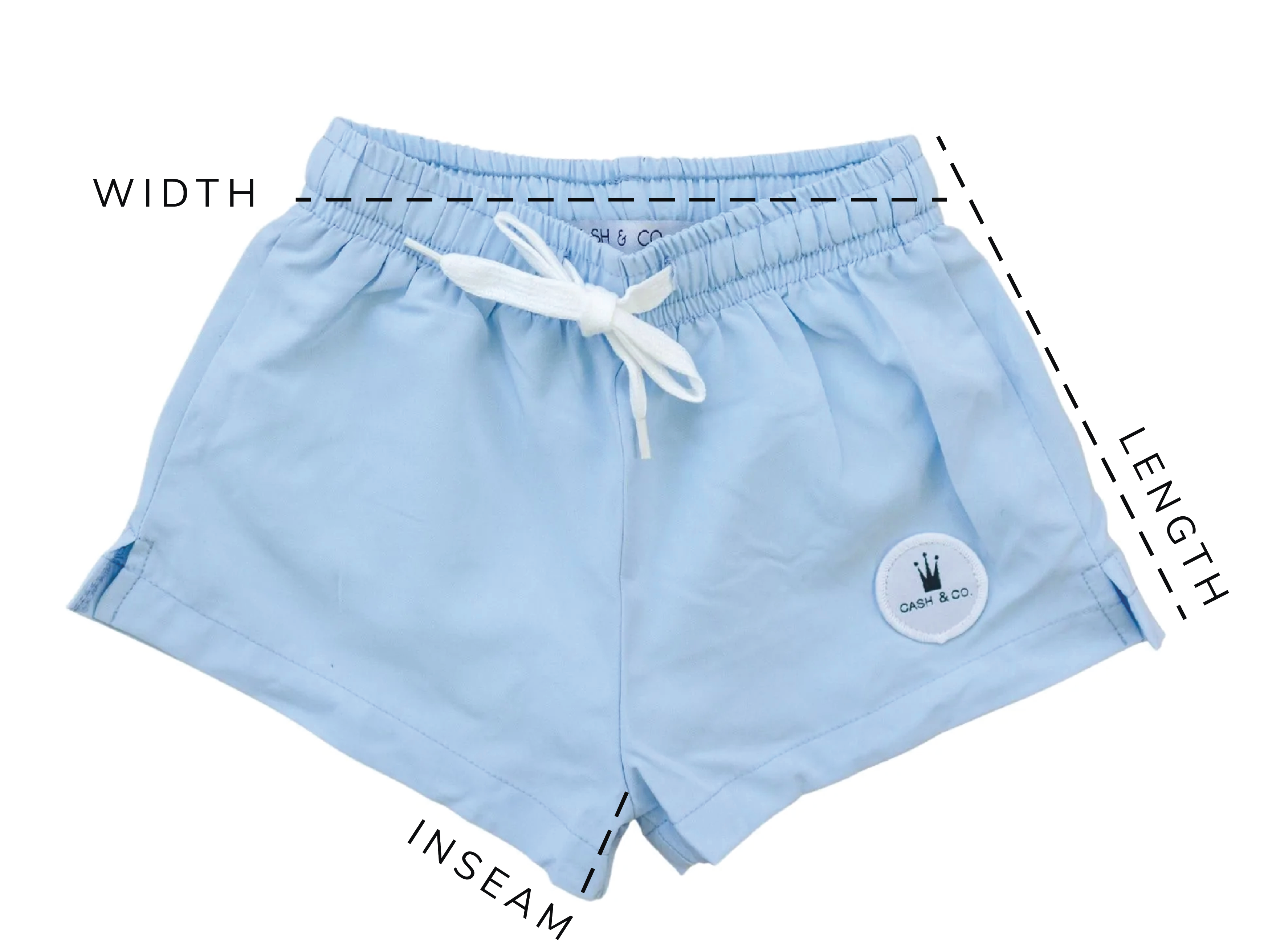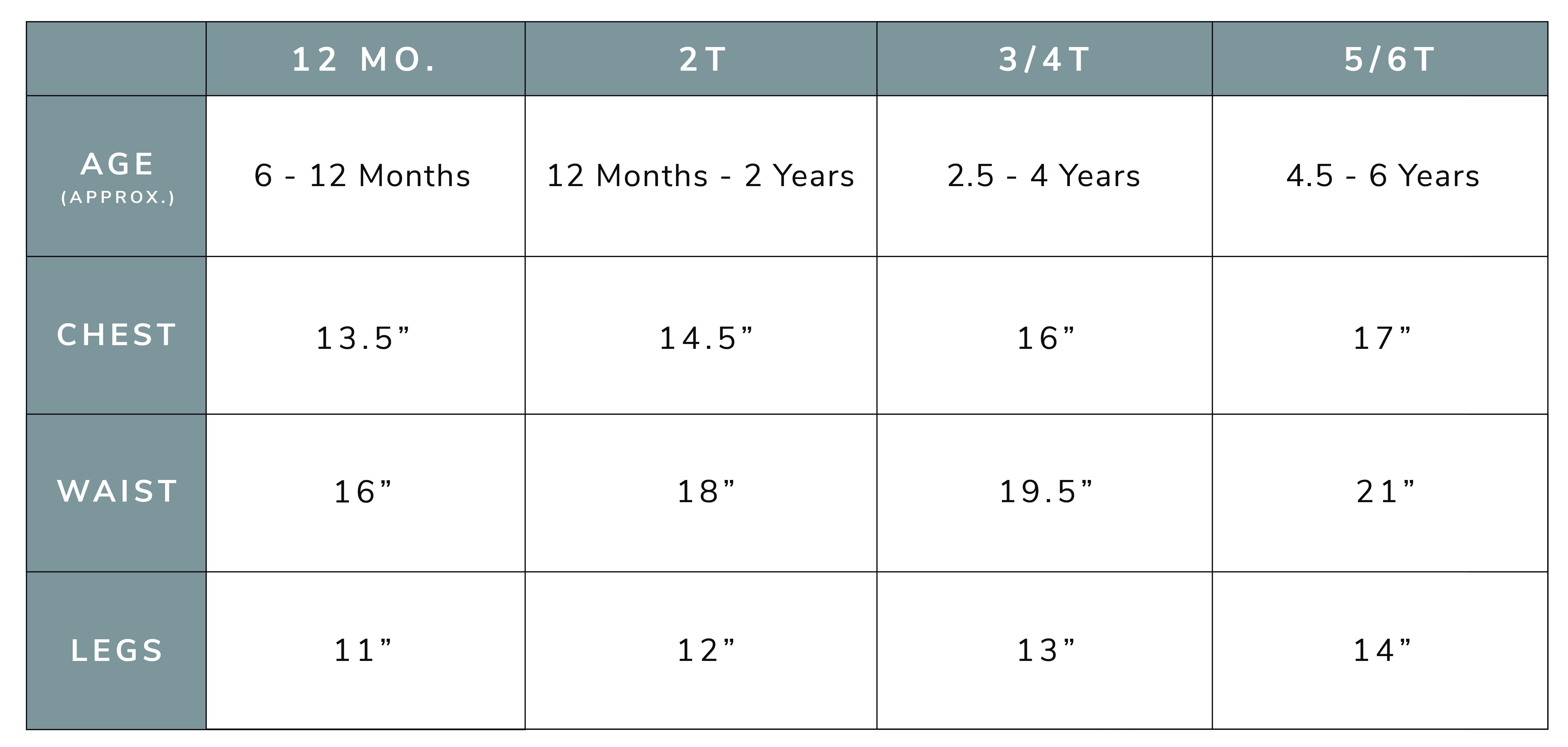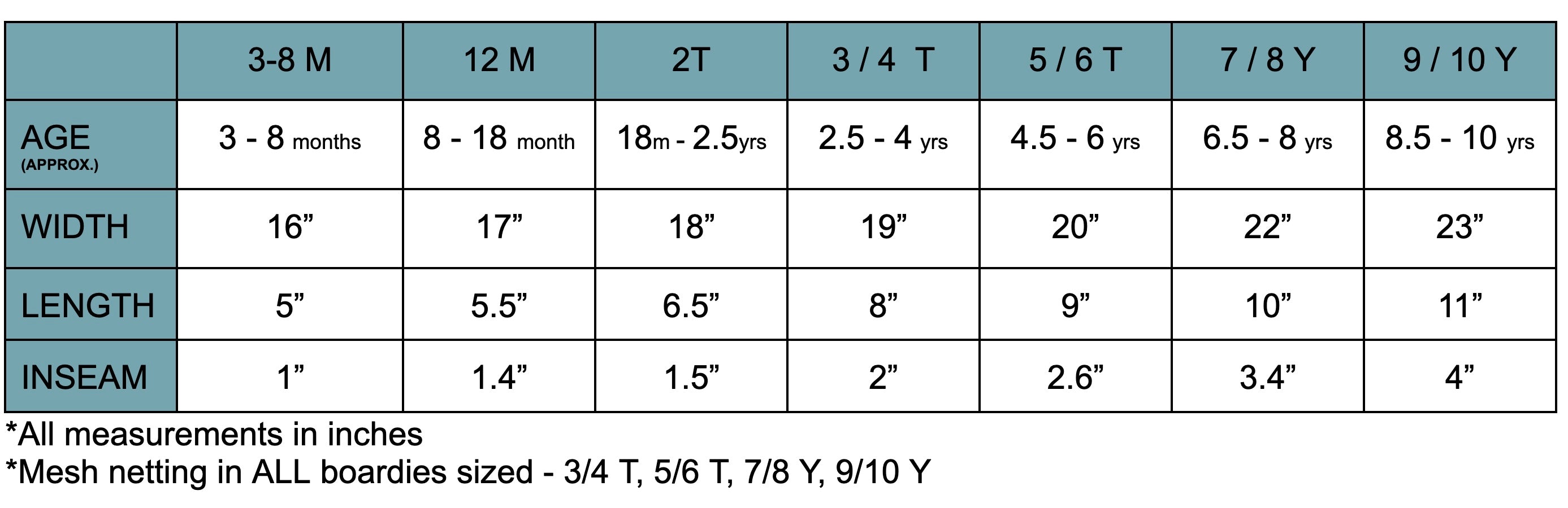 All swim pieces are European cut and fit as stated below. All boy and girl suits have ties for adjustability and overall comfort. When in doubt, size up!